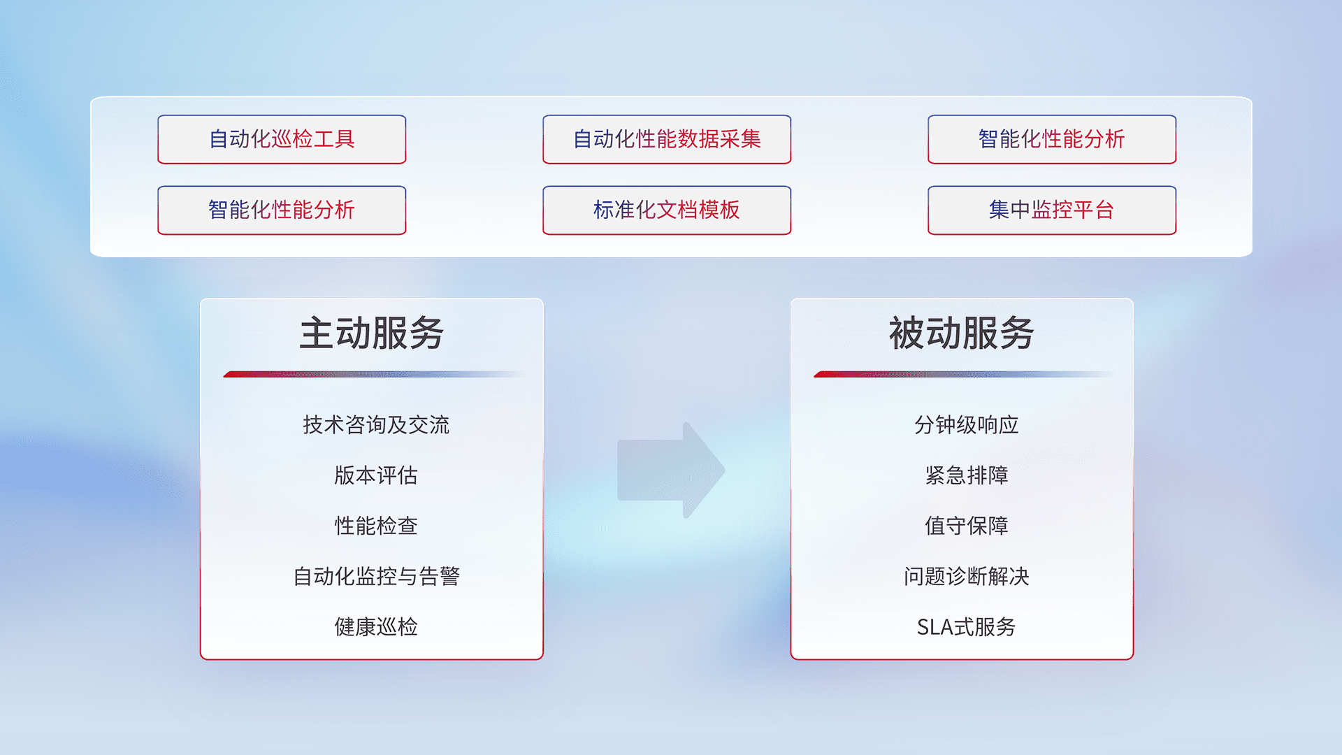 智能化工具和标准化文档,,保障服务质量,,,提供主动服务(包含技术咨询、、、版本评估、、、性能检查、、、自动化监控与告警、、、、健康巡检)和被动服务包含(分钟级响应、、、、紧急排障、、、、值守保障、、、、问题诊断解决、、SLA服务)。。。